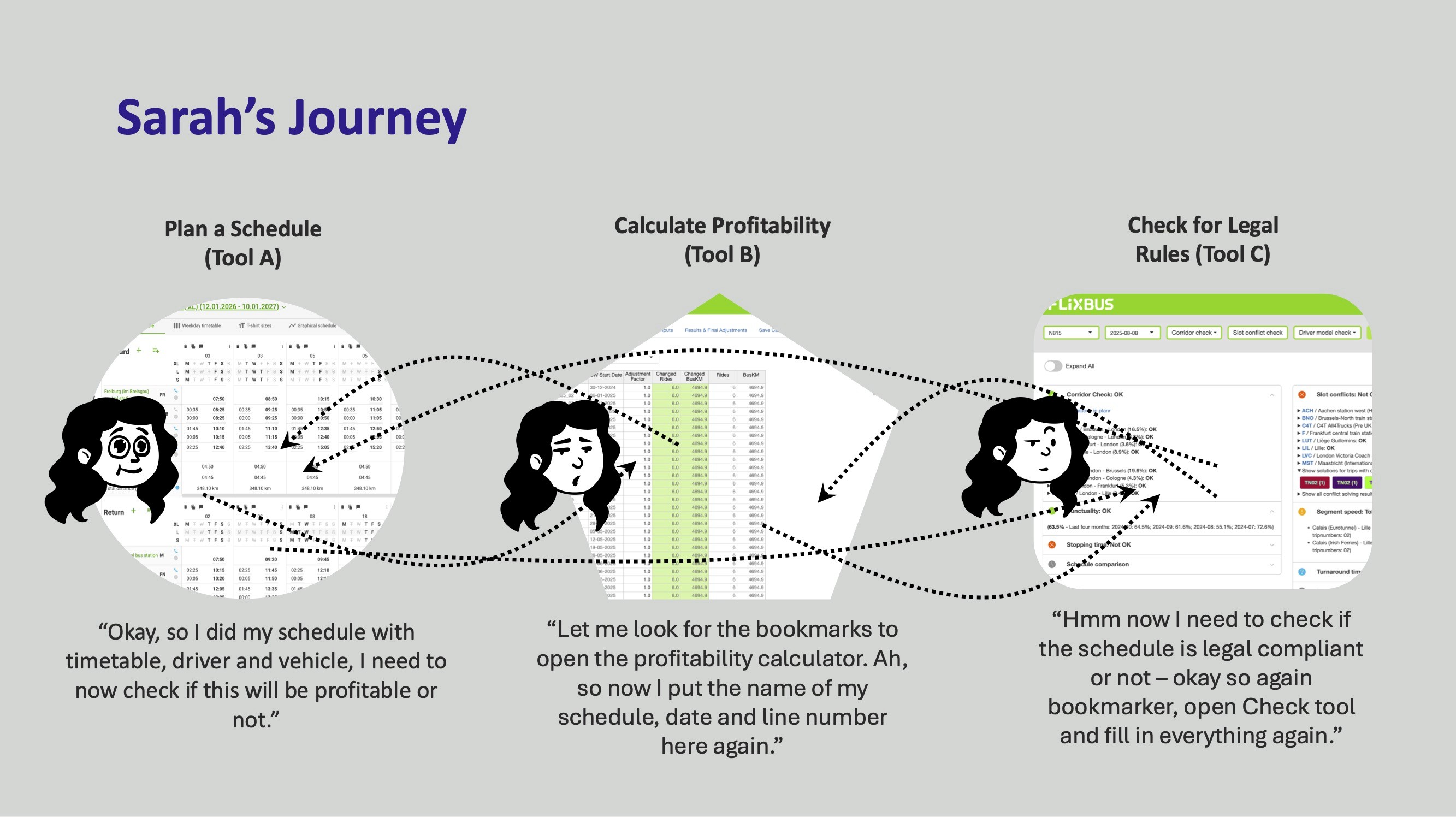 Network planners were juggling 5-6 disconnected tools daily: historical performance analytics, route planning interfaces, demographic data dashboards, profitability calculators, and operations research optimisation systems. This constant tool switching created significant workflow inefficiencies, with each system lacking contextual awareness of the others, resulting in complex onboarding processes and frequent user errors.
